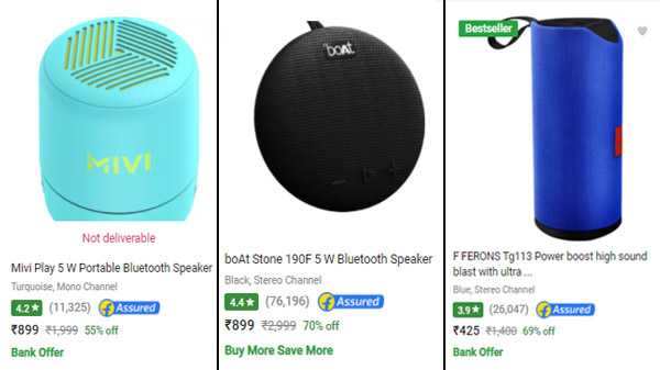 અને આ સૂચિ ની અંદર ઘણી બધી બ્રાન્ડ ના સ્પીકર્સ નો સમાવેશ કરવા માં આવેલ છે જેની અંદર બોટ, ઝઈબ્રોનીકસ, પીટ્રોન, મિવી વગેરે નો સમાવેશ કરવા માં આવેલ છે. દા.ત. તમે મિવી પ્લે 5 ડબ્લ્યૂ પ્રોટેબલ બ્લુટુથ સ્પીકર ને માત્ર રૂ. 899 ની કિંમત પર ખરીદી શકો છો. અને તમે એમ્બરને બીટી 47 5ડબ્લ્યૂ બ્લુટુથ સ્પીકર ને માત્ર રૂ. 799 ની કિંમત પર ખરીદી શકો છો.