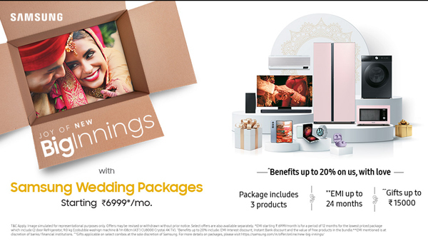 વેડિંગ પેકેજિસ અંતર્ગત કંપની પોતાની ઘણી પ્રોડક્ટ્સ પર સિઝનલ ડિસ્કાઉન્ટ આપી રહી છે. આ ન્યૂ બિગિનિંગ્સ કાર્યક્રમ અંતર્ગત કંપની લગ્નગાળા દરમિયાન વેચાણ વધારવા પર ફોકસ કરી રહી છે. આ ઓફર અંતર્ગત ડિસ્કાઉન્ટની સાથે સાથે કંપની સ્માર્ટફોન, હોમ એન્ટરટેઈનમેન્ટ ડિવાઈસિઝ અને ઓડિયો પ્રોડક્ટ્સની મોટી રેન્જ ઓફર કરી રહી છે. જો ગ્રાહકો લેટેસ્ટ સેમસંગ ફોલ્ડેબલ ફોન જેમ કે Galaxy Z fold 5, Galaxy Z Flip 5ની સાથે સાથે Galaxy Watch 6 Classic, Galaxy Watch 6 અથવા તો Galaxy Buds 2 ખરીદશે, તો ગ્રાહકોને 7 ટકાનું ડિસ્કાઉન્ટ મળશે.