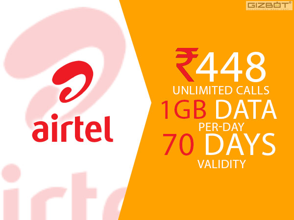 એરટેલે રૂ. 448 યોજના 70 દિવસ માટે દરરોજ અમર્યાદિત કોલ અને 70 દિવસ સુધી રોજ 1GB