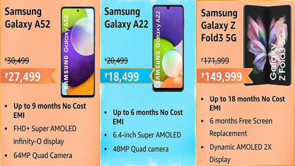 સેમસંગ ગેલેક્સી એસ20 અલ્ટ્રા, ગેલેક્સી નોટ 20 અલ્ટ્રા, ગેલેક્સી એસ21 અલ્ટ્રા, વગેરે જેવા સ્માર્ટફોન્સ પર ડિસ્કાઉન્ટ અને ઓફર્સ આપવા માં આવી રહી છે. અને તેની સાથે સાથે તાજેતર માં લોન્ચ કરવા માં આવેલ ગેલેક્સી ઝેડ ફલોડ 3 અને ગેલેક્સી ફ્લિપ 3 સ્માર્ટફોન્સ ને પણ એમેઝોન ગ્રેટ ઇન્ડિયન ફેસ્ટિવલ સેલ ની અંદર સમાવેશ કરવા માં આવેલ છે.