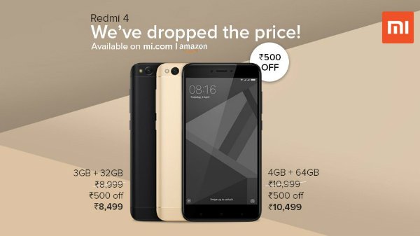 ઝિયામી રેડમી 4 સ્માર્ટફોન ને 500 રૂપિયા પ્રાઇસ કટ બાદ, 3 જીબી રેમ અને 32 જીબી ઇન્ટરનલ સ્ટોરેજની રેડમી 4 ની કિંમત 8,499 રૂપિયા અને 4 જીબી રેમ અને 64 જીબી ઇન્ટરનલ સ્ટોરેજ સાથેનું વર્ઝન 10,499 રૂપિયા છે હવે માટે, 2 જીબી રેમ અને 16 જીબી ઇન્ટરનલ સ્ટોરેજની કિંમતે કોઈ જાહેરાત કરી નથી.
